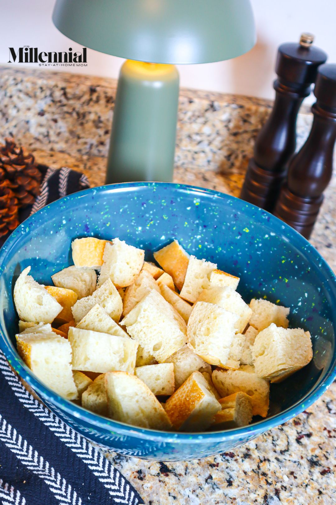 Preheat the oven to 375° Fahrenheit and line a baking sheet with parchment paper. To prepare the croutons, take the loaf of French bread and cut it into cubes of your desired size. I’ve found that the bigger the cubes are, the better!